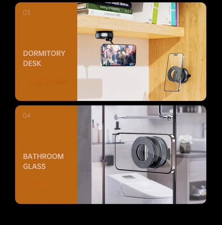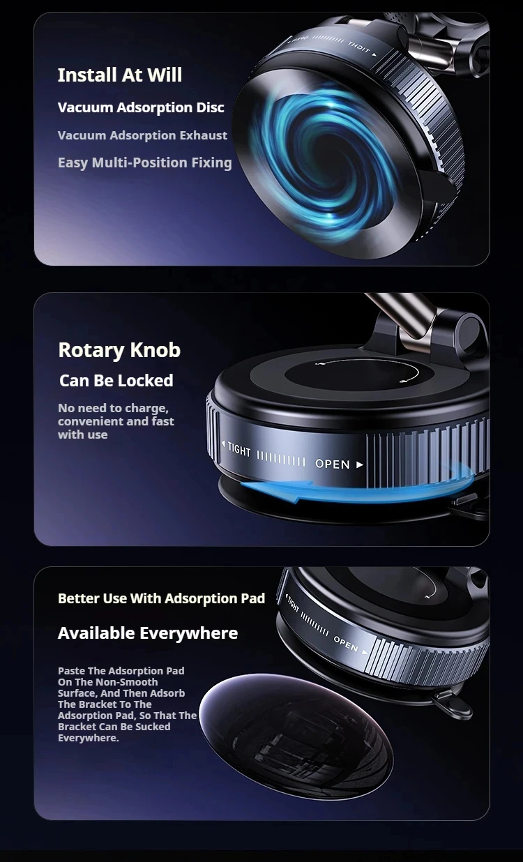 Featuring a vacuum suction design, this phone holder provides double-sided adhesion, allowing it to securely attach to various surfaces. Whether you're placing it on your dashboard or windshield, you can trust its stable grip for universal use.